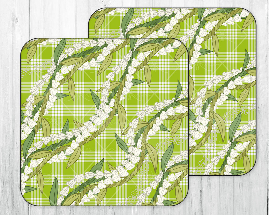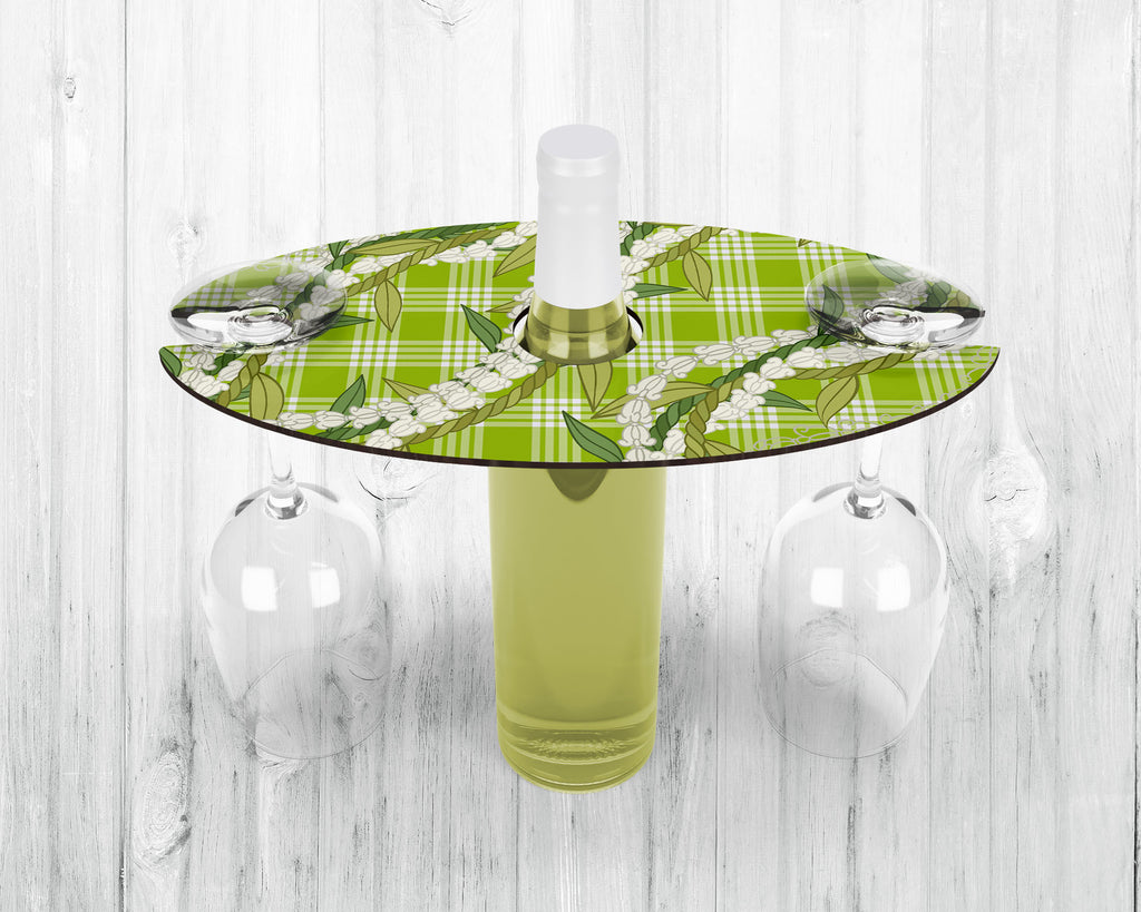 Wine Caddy & Coaster Set • Gift • Lime Green Palaka • White Crown Flower Ti Leaf